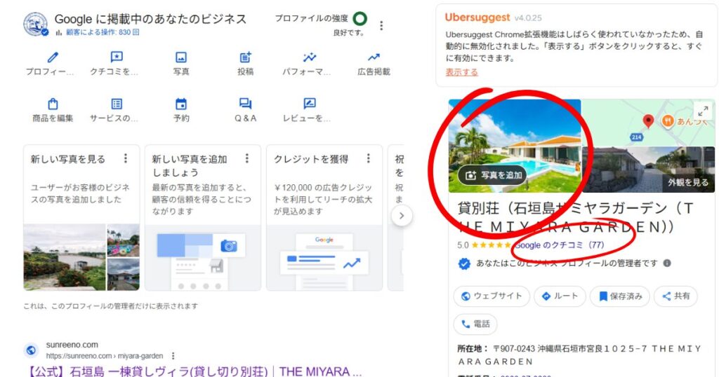 Googleマイビジネス(Googleマップ)のお客様のレビュー、評価、写真のアップも、ご宿者の方にお願いしておきましょう。写真は自社でもアップしていけます。ただ、お客様が投稿してくれる写真は、予約検討者にとっても説得力があり価値が高いです。