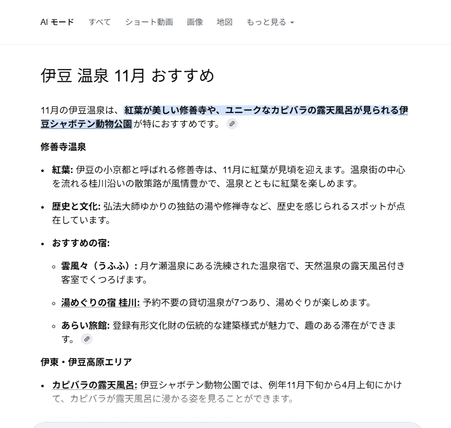 実際に、新しくGoogleの導入された「AIモード」という検索結果表示画面でも、下の方で、「雲風々、湯めぐりの宿桂川、あらい旅館」などの情報も出てきています。